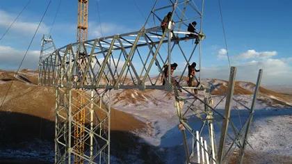 國網(wǎng)青海送變電公司施工人員在青豫特高壓直流工程建設(shè)現(xiàn)場組立鐵塔